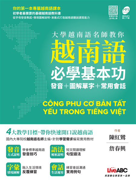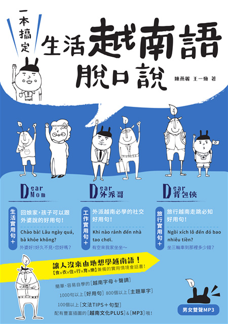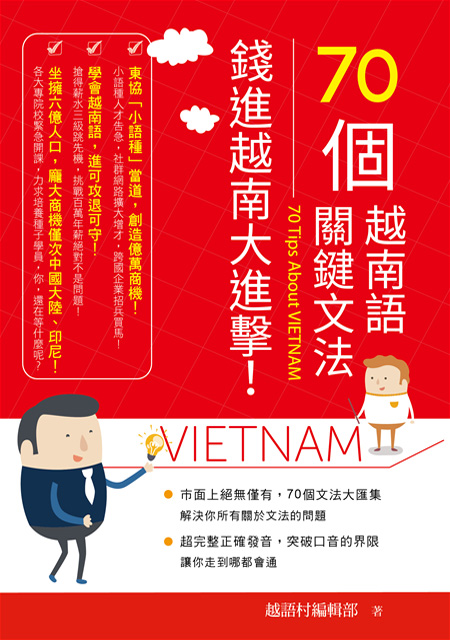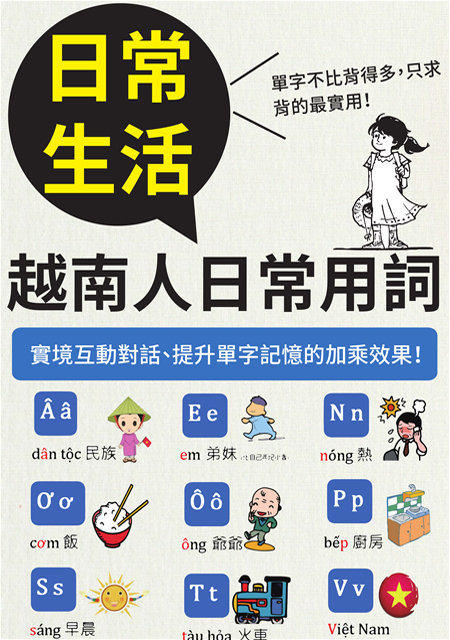 筆者根據多年在臺灣生活、研究,以及在許多大學、企業擔任越南語教師的經驗,站在學習者的立場歸納出最有效學習越南語的方法。這本書以「食、衣、住、行、育、樂」生活六大主題,介紹最實用的內容,並且重視練習「聽、說、讀、寫」四個技能,希望學習者能在短期之內開口說出越南語,了解並融入越南當地的文化。——《速學越南語》
